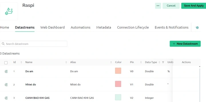Ta tiến hành tạo thiết bị mới với nút New Device. Tiếp theo ta tạo các thông số về cảm biến với Datastream.